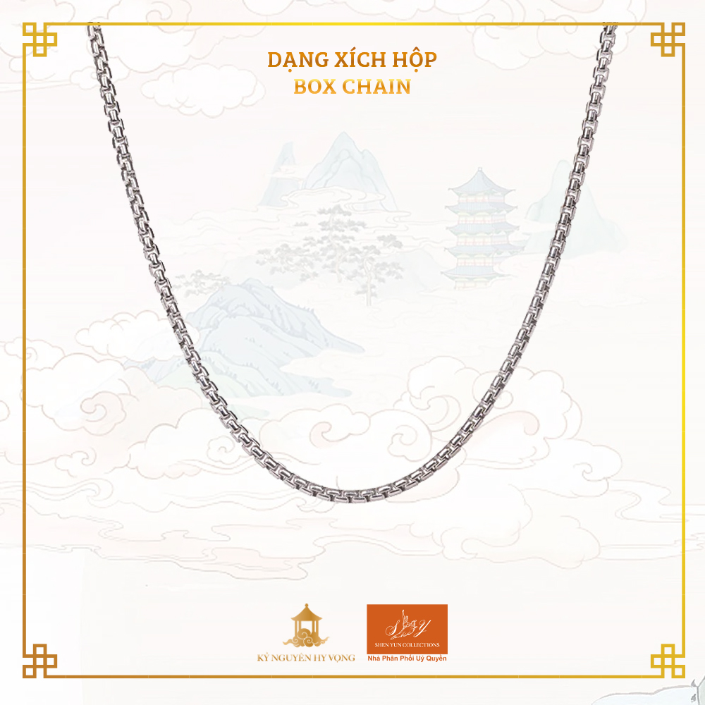 Với các mắt xích hình vuông tạo nên bề mặt sáng bóng và nối tiếp, dây chuyền box chains mang đến sự chắc chắn và tinh tế, hoàn hảo cho những mặt dây chuyền có trọng lượng nặng.