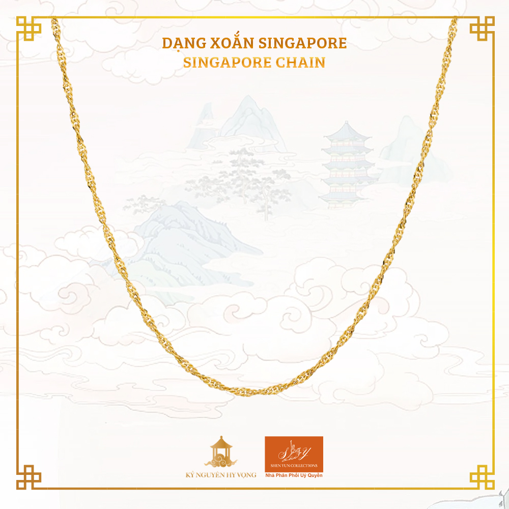 Với thiết kế xoắn và bện độc đáo, dây chuyền Singapore phản chiếu ánh sáng từ nhiều góc độ, tạo hiệu ứng lấp lánh, giúp tăng thêm vẻ quyến rũ cho bất kỳ món trang sức nào.