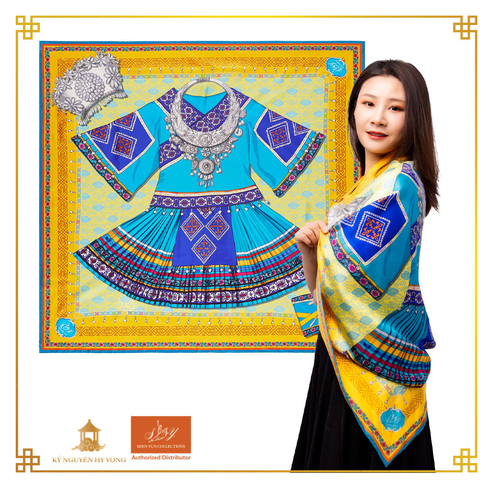 Lấy cảm hứng từ truyền thống lâu đời của người Miêu và điệu múa Shen Yun “Làng Miêu”, chiếc khăn lụa Làng Miêu của Shen Yun Collections tôn vinh vương miện bạc của người Miêu. Các chi tiết tinh xảo và màu sắc dễ chịu của trang phục Shen Yun được sử dụng làm yếu tố thiết kế, thể hiện ý nghĩa văn hóa quan trọng và phong tục dân tộc của người Miêu.