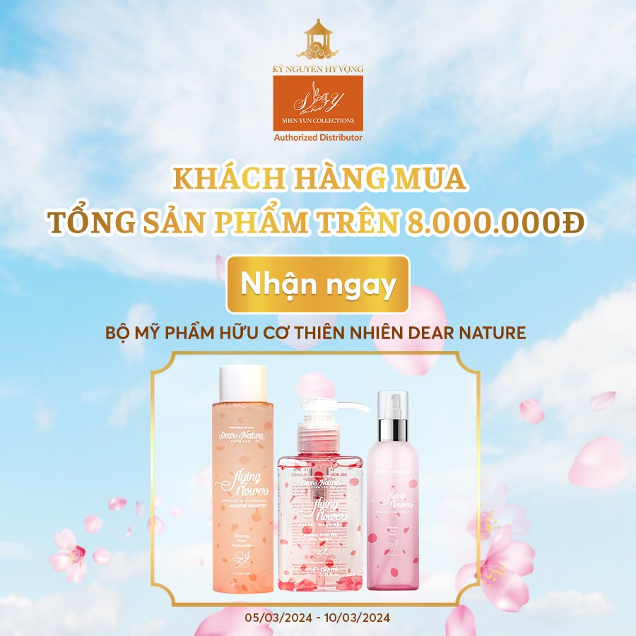 TẶNG NGAY 1 Bộ Mỹ Phẩm Hữu Cơ Thiên Nhiên (gồm 1 tẩy trang + 1 gel rửa mặt + 1 toner chiết xuất hoa hồng) - cho vẻ đẹp nàng luôn rạng rỡ tự tin - khi mua các sản phẩm của thương hiệu Shen Yun Collections với tổng trị giá trên 8 triệu đồng